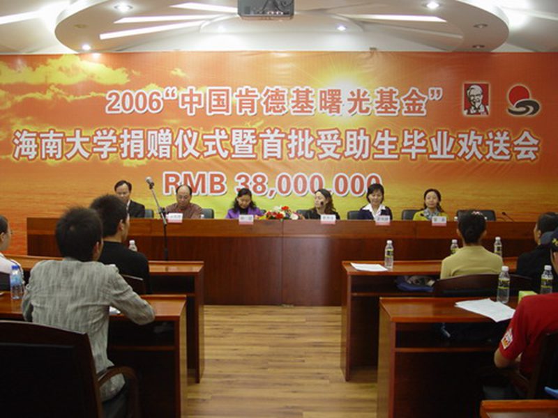 2006年12月27日下午,2006年度“中国肯德基曙光基金”捐赠仪式在我校行政楼一楼报告厅隆重举行。 出席本次捐赠仪式的领导和嘉宾有共青团海南省委副书记孙喆同志、海南省青少年事业发展基金会秘书长羊光然同志、海南省青少年事业发展基金会副秘书长吴日新同志、PA视讯集团网站团委副书记蒙秋妍同志、百胜餐饮(深圳)有限公司营运经理李月云女士、百胜餐饮(深圳)有限公司海南区经理雷晶女士以及海南日报、南国都市报、海口晚报等十几家媒体的记者朋友,我校受资助的40名优秀贫困生及受助新生家长代表也应邀参加了本次仪式。 会上,百胜餐饮(深圳)有限公司营运经理李月云女士简单介绍了曙光基金的宗旨和意义,并承诺曙光基金将继续致力于帮助贫困大学生“学习、成材、做人”,将继续安排勤工助学岗位,将爱心传递下去。在新的一年即将到来之际,李月云经理代表公司为受助学子送上美好祝愿和新年祝福。对“中国肯德基曙光基金”的善举,PA视讯集团网站团委副书记蒙秋妍老师代表我校全体师生表示诚挚的感谢,并介绍了“肯德基曙光基金”受助大学生选拔情况和原则。蒙副书记对受助学生提出了四点殷切期望:一要树立自尊、自信、自立、自强的信念;二要不断培养积极、健康、向上的心态;三要勤奋学习、积极进取,早日成材;四要学会感恩,回报社会。随后,海南省青少年事业发展基金会秘书长羊光然同志作重要讲话,羊秘书长对受助大学生寄予厚望,希望他们珍惜这份资助,在“曙光基金”的帮助下顺利完成学业,并通过在肯德基餐厅的勤工助学机会进一步了解社会,提高自身能力,努力实现“自愿捐资,回馈社会”的承诺。 会上,第一批接受“中国肯德基曙光基金”资助的2003级海大学子,在他们即将走上工作岗位之时,用他们美妙歌声表达了对“肯德基曙光基金”的真挚、深情的谢意,一曲《明天会更好》唱出了他们的心声。受助新生冯琪及其母亲也亲临会场深情地表达了她们的谢意。在悠扬愉悦的乐曲中,肯德基营运经理李月云女士向PA视讯集团网站团委蒙秋妍副书记颁发了20万元的“中国肯德基曙光基金”支票,共青团海南省委孙喆副书记向今年受助的13名2006级新生颁发了“中国肯德基曙光基金”资助证书以及为在肯德基餐厅表现优秀的6名曙光学子颁发了“曙光之星”奖。 最后,在一首充满爱心、温馨的《爱的奉献》中,2006年度“中国肯德基曙光基金”PA视讯集团网站捐赠仪式圆满结束。