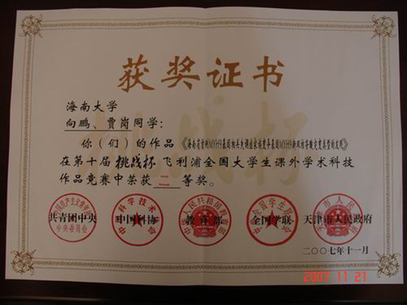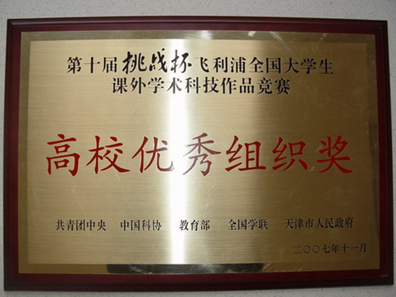 2007年11月14日至20日,第十届“挑战杯”飞利浦全国大学生课外学术科技作品竞赛的终审决赛在天津南开大学隆重举行。“挑战杯”全国大学生课外学术科技作品竞赛是一项具有导向性、示范性和群众性的全国竞赛活动,是全国大学生学术科技活动中层次最高、规模最大的盛会,被誉为中国大学生学术科技“奥林匹克”。第十届“挑战杯”由共青团中央、中国科协、教育部、全国学联和天津市人民政府联合主办,南开大学承办。参赛高校多达600余所,近百万名大学生参与,参赛的港澳台地区高校也达到创纪录的25所,还有美国耶鲁大学、英国国王学院等6所外国高校代表共襄盛会。