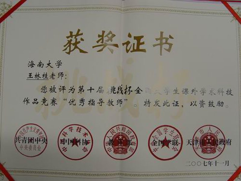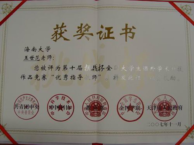 在2007年的“挑战杯”比赛中,我校选送的参赛作品荣获全国二等奖1项、三等奖3项;获海南省一等奖2项、二等奖6项、三等奖4项。这其中凝聚了指导教师大量的心血。为了确保课题能够顺利完成并在比赛中取得好的成绩,许多指导教师牺牲了休息时间,和课题组的同学不分昼夜地工作在实验室、办公室里,悉心指导、默默奉献,为增强学生的创新意识和实践能力付出了辛勤的汗水,也为学校争得了荣誉。正是由于他们的辛勤付出,才使我校的学生科技氛围越来越浓,学生参与课外科技活动的积极性也日益高涨。附:王世范、王林桂2位教师工作简介
