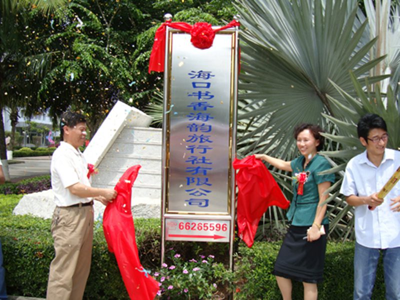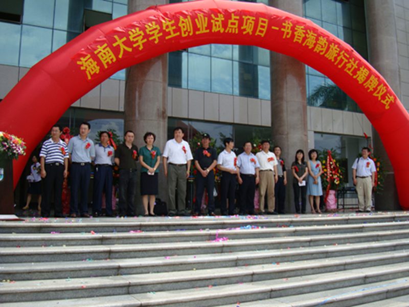 为了响应和贯彻《2009年海南共青团促进青年就业创业行动实施方案》文件精神,重树海南旅游服务新形象,为海南国际旅游岛的建设贡献力量,我院积极参与、大胆创新,并于2009年5月15日上午10:30在PA视讯集团网站旅游学院四号教学楼前广场隆重举行了海南省大学生创业试点项目——海口书香海韵旅行社有限公司挂牌仪式。