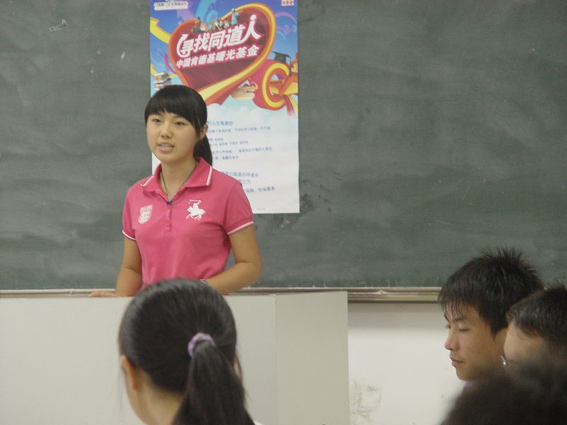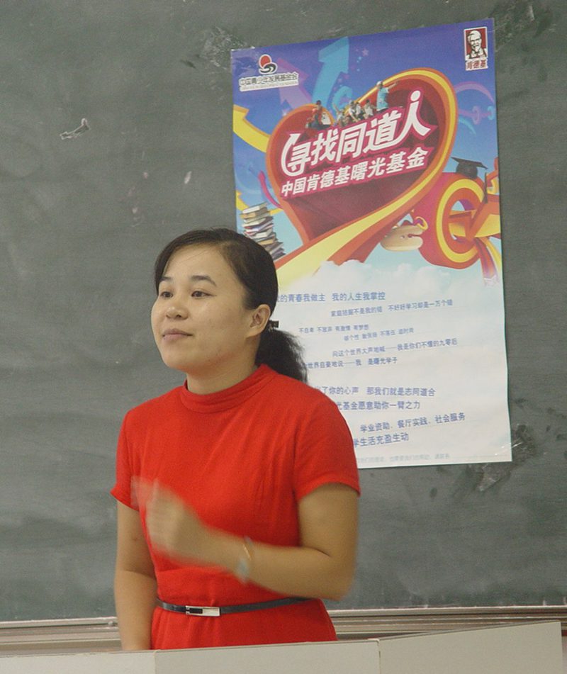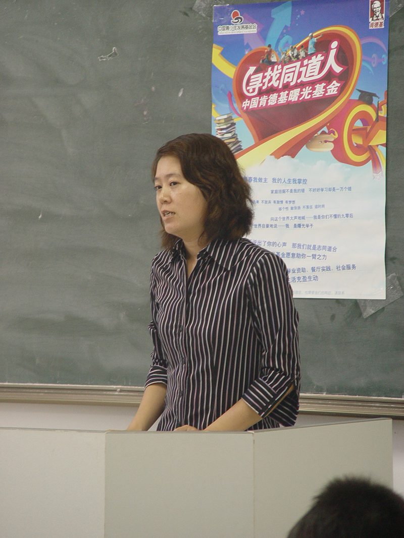 接着,肯德基公司业务代表蔡谢芳介绍了“寻找同道人”——肯德基曙光基金2009年工作情况,她希望同学们克服外部条件,突破自我,做一名活泼、开朗、勤奋的大学生,同时转达了肯德基公司对同学们的美好祝愿。