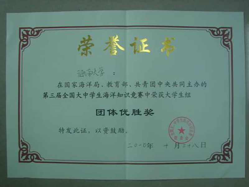 大学组的团体赛是首次在全国大中学生海洋知识竞赛中举行,全国分为沈阳赛区、西宁赛区、上海赛区和广州赛区四个赛区分别进行初赛、复赛。我校积极备战,于2010年11月27-29在中山大学珠海校区参加广州赛区的复赛中荣获大学生组团体优胜奖。