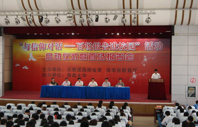 4月22日下午,由共青团海南省委、海南省教育厅联合举办的“与信仰对话——百场报告进校园”活动启动仪式暨首场报告会在我校行政楼二楼报告厅举行。团省委副书记盖文启、省教育厅副巡视员李德杰、PA视讯集团网站党委副书记陈封椿出席了启动仪式,来自全省高校的团委书记和400余名学生代表参加了此次活动。仪式由团省委学校部负责人主持。 仪式上,省教育厅直属机关团委书记、办公室副主任曾维陆首先介绍了本次活动的基本情况。他指出,今年是中国共产党建党90周年,是海南教育实施“十二五”规划的起始之年和启动实施各项改革创新工作的关键之年,举办此次“与信仰对话——百场报告进校园”活动,将有利于进一步坚定我省大学生跟党走中国特色社会主义道路的理想信念,推进我省高校大学生德育教育工作的科学发展。 仪式上,省教育厅副巡视员李德杰同志作了讲话。他指出,本次活动是在全省深入推进学习实践科学发展观活动,集中精力建设国际旅游岛之际,省委教育工委、省教育厅和团省委贯彻落实中组部、中宣部等6部门联合下发的《关于在党员、干部、群众和青少年中开展中共党史学习教育的通知》精神的一项重要举措,是贯彻落实省委五届九次全会精神,动员、激励全省广大青年重温历史,缅怀先烈,投身国际旅游岛建设的有效形式。他重温了海南青年忠诚于党和祖国的光荣革命传统,同时对我省青年学生提出了三点要求:一是广大青年学生要坚定信念,志存高远;二是广大青年学生要勤奋学习,增长才干;三是广大青年学生要勇于实践,矢志艰苦创业。 我校的史旭峰同学代表我省大学生在启动仪式上发言,他深情回顾了我党的丰功伟绩,深切缅怀了无数革命烈士,表达了要坚定跟党走中国特色社会主义的理想信念,要勤奋学习、增强综合素质,要投身实践、报效祖国、立志成才的信心和决心,要把对党和社会主义祖国的朴素感情转化为积极投身中国特色社会主义事业和海南省国际旅游岛建设的动力。 团省委副书记盖文启同志宣布“与信仰对话——百场报告进校园”活动正式启动。自此,全省青年学生将掀起学习党的历史、普及党的知识的热潮。 此次活动旨在庆祝中国共产党成立90周年,贯彻落实中组部、中宣部、教育部等六个部门联合下发的《关于在党员、干部、群众和青少年中开展中共党史学习教育的通知》精神,根据全团关于“学党史、知党情、跟党走”主题教育活动的安排部署,引导我省大学生更好地了解党在革命、建设和改革的各个历史时期的奋斗足迹,更好地投身海南国际旅游岛建设。共青团海南省委、海南省教育厅联合在全省高校中组织开展了“与信仰对话——百场报告进校园”活动,各高校高度重视,积极响应,通过各种渠道,精心组织广大学生参加和互动,力争做到全覆盖。每所学校至少举办6场次,每次参加的学生有300余人,全省将举办至少100场次。 本次活动以“青春辉映党旗红”为主题,以“学党史、知党情、跟党走”为主线,是我省各级团组织隆重庆祝建党90周年系列主题教育活动之一。旨在引导广大高校学生发自内心地认同党、热爱党,唱响“共产党好、社会主义好、改革开放好、伟大祖国好、各族人民好”的时代主旋律。活动主要包括两方面的内容。一是举办党史党情报告会。通过主讲人的正面引导,加深大学生对党的历史、党的知识、党的理论和路线方针政策的认识,从而深刻理解党的领导是历史的选择、人民的选择,深刻理解只有社会主义才能救中国,只有改革开放才能发展中国,并迅速在全省高校范围内掀起学习党的历史、普及党的知识的热潮。二是举办形势政策宣讲会。邀请地方党政部门领导和享有较高知名度的社会名人、杰出校友等,为广大青年学生做形势政策宣讲,帮助广大青年学生认识国情省情。 为确保本次活动的圆满成功,共青团海南省委、海南省教育厅还专门成立了专家讲师团。讲师团由10位高校知名教授组成。讲师团以专题报告的形式,通过对我国国情和海南省情的讲解,让广大青年学生明确如何肩负起报效祖国、繁荣海南的历史使命。