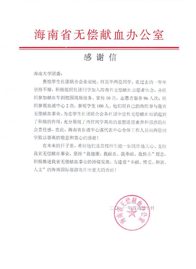 我校学生社团联合会学生干部受到省无偿献血办公室表扬