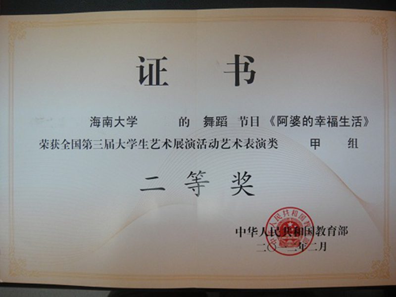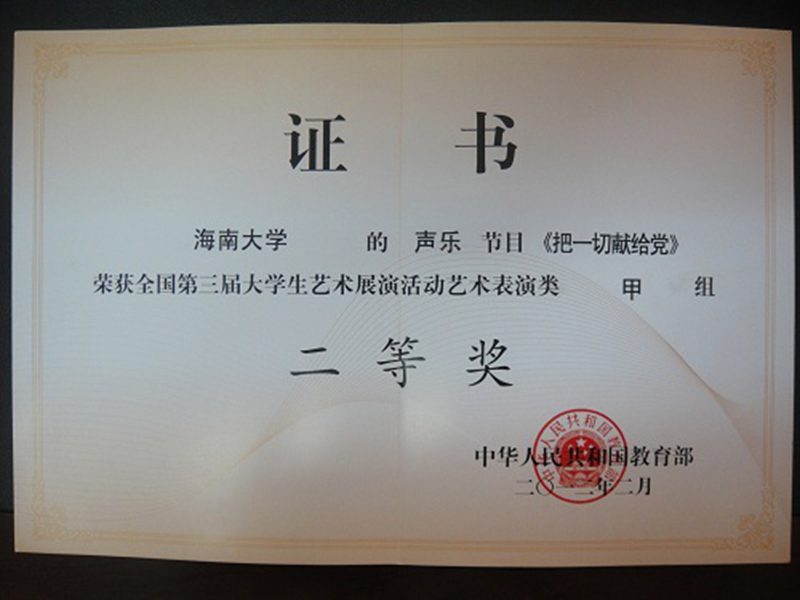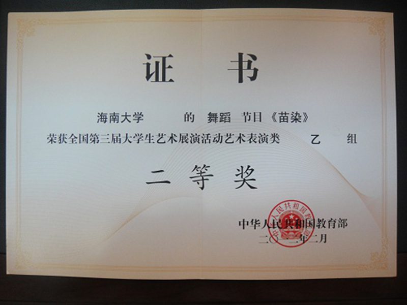 在第三届大学生艺术展演活动中,我校多个节目获奖。声乐节目《把一切献给党》获艺术表演类甲组二等奖,舞蹈《阿婆的幸福生活》获艺术表演类甲组二等奖,舞蹈《苗染》获艺术表演类乙组二等奖,为我校争得了荣誉。//www.hainanu.edu.cn