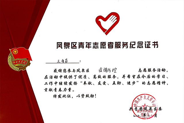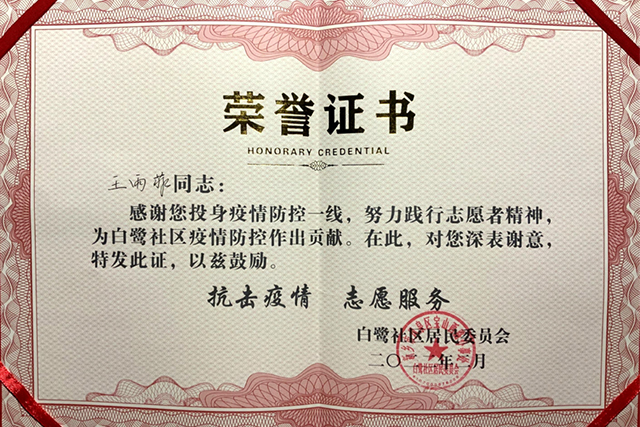 志愿服务期间,王雨菲同其他志愿者在寒冷的冬日里坚持每天在岗,核实社区居民情况、为社区居民办理出入证,帮助不会使用健康码行程卡的居民操作健康码行程码,轮班值岗查验入社区的行人、车辆的行程卡、健康码,为居民解答来(返)新人员服务管理措施……保证了社区居民的安全,为防疫工作贡献出力量。