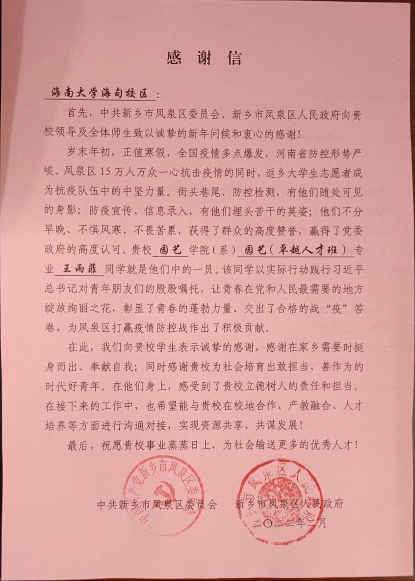 谈及此次志愿初衷,她说:“2021年7月河南暴雨,我们获得了来自四面八方的关心和厚爱,于我个人来讲,学校设立临时困难补助、学院的领导老师们的担忧与关怀鼓励、同学们的关心问候都使我倍感温暖。如今洪水退去疫情袭来,我要用感恩与坚毅,在今后的志愿服务中,奉献我所能奉献、担当我所能担当,回报社会、回报人民,向世人承诺,生逢盛世,我们青年当不负盛世!”王雨菲用实际行动彰显了预备党员不畏艰苦、为民服务的精神,体现了园艺学院青年学子的奉献与担当。
