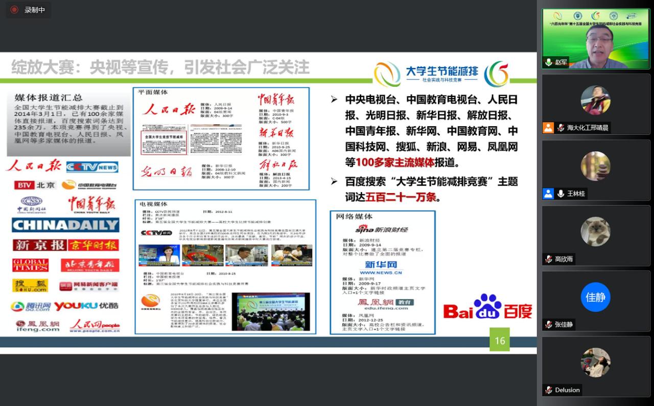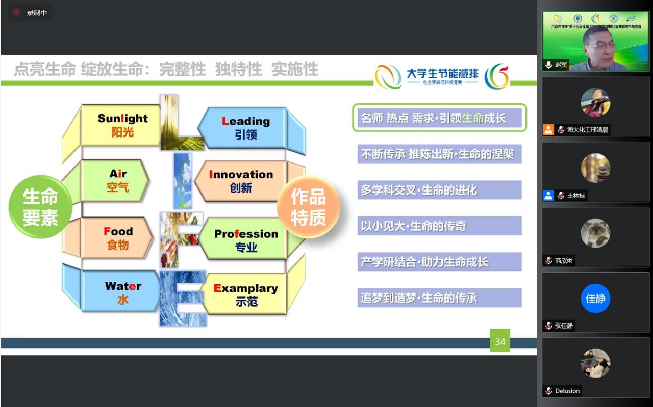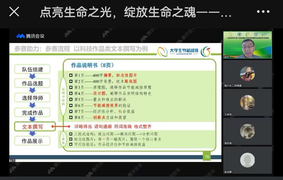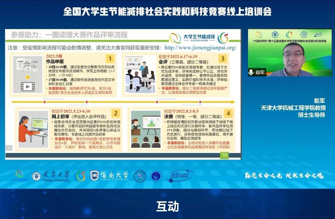 为使广大师生深入了解全国大学生节能减排社会实践与科技竞赛相关内容,进一步激发海大学子参与大学生节能减排赛事的热情,PA视讯集团网站化学工程与技术学院有幸邀请到全国大学生节能减排赛事专家——天津大学机械工程学院赵军教授,于2022年4月10日15:30通过腾讯会议及直播平台为海大师生进行了题为《“点亮生命之光 绽放生命之魂”全国大学生节能减排社会实践与科技竞赛实录》的线上培训会。赵军教授长期致力于全国大学生节能减排社会实践与科技竞赛,曾任第十四届全国大学生节能减排科技竞赛专家委员会副秘书长,主要从事数字型零碳综合能源新理论、新方法以及新技术的研究。此次线上培训会,赵军教授主要就大学生节能减排赛事的发展历程、参赛作品、参赛与评审流程、评分要点、政策变化和作品格式等内容进行了详细讲授。