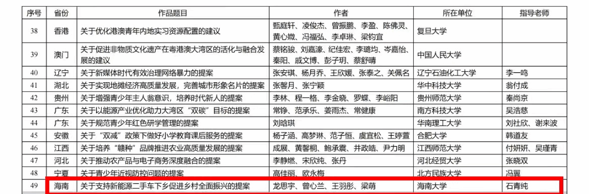 近日,我校龙思宇、曾心兰、王羽彤、梁萌同学在石青纯老师的指导下报送的关于支持新能源二手车下乡促进乡村全面振兴的提案项目入选2023年全国青少年模拟政协提案征集活动“最佳模拟政协提案作品”(大学组)。此提案求真务实,为加快推进乡村振兴建言献策。在推动乡村地区的绿色发展和可持续发展,提升农民生活质量,推动乡村地区的绿色转型等多个方面具有参考价值。
