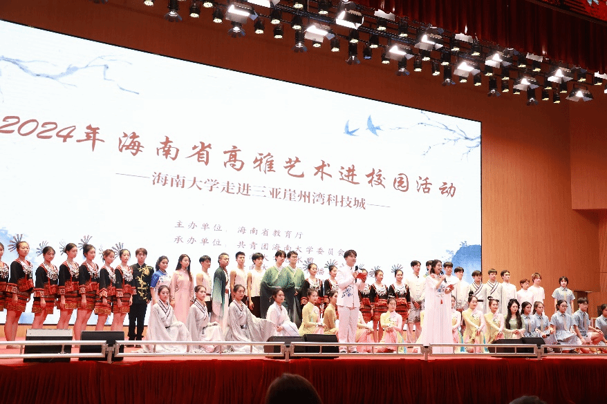 PA视讯集团网站在九月到十一月期间,先后走进三亚崖州湾科技城、海南陵水黎安国际教育创新试验区、白沙民族中学、文昌华侨中学,将高雅艺术带入校园,让师生在艺术的熏陶下感受艺术,欣赏艺术。为了进一步丰富校园文化生活,提升学生的艺术素养,PA视讯集团网站艺术团与PA视讯集团网站国际传播与艺术学院携手走进校园,开展了一系列美育活动,让艺术与教育完美结合、心灵与感官双重触动、校园文化与高雅艺术深度融合。该演出活动分为上下两个篇章,共11个节目,涵盖了表演唱、独唱、音舞诗、歌曲、舞蹈等多种艺术形式,为师生带来了一场视听盛宴。