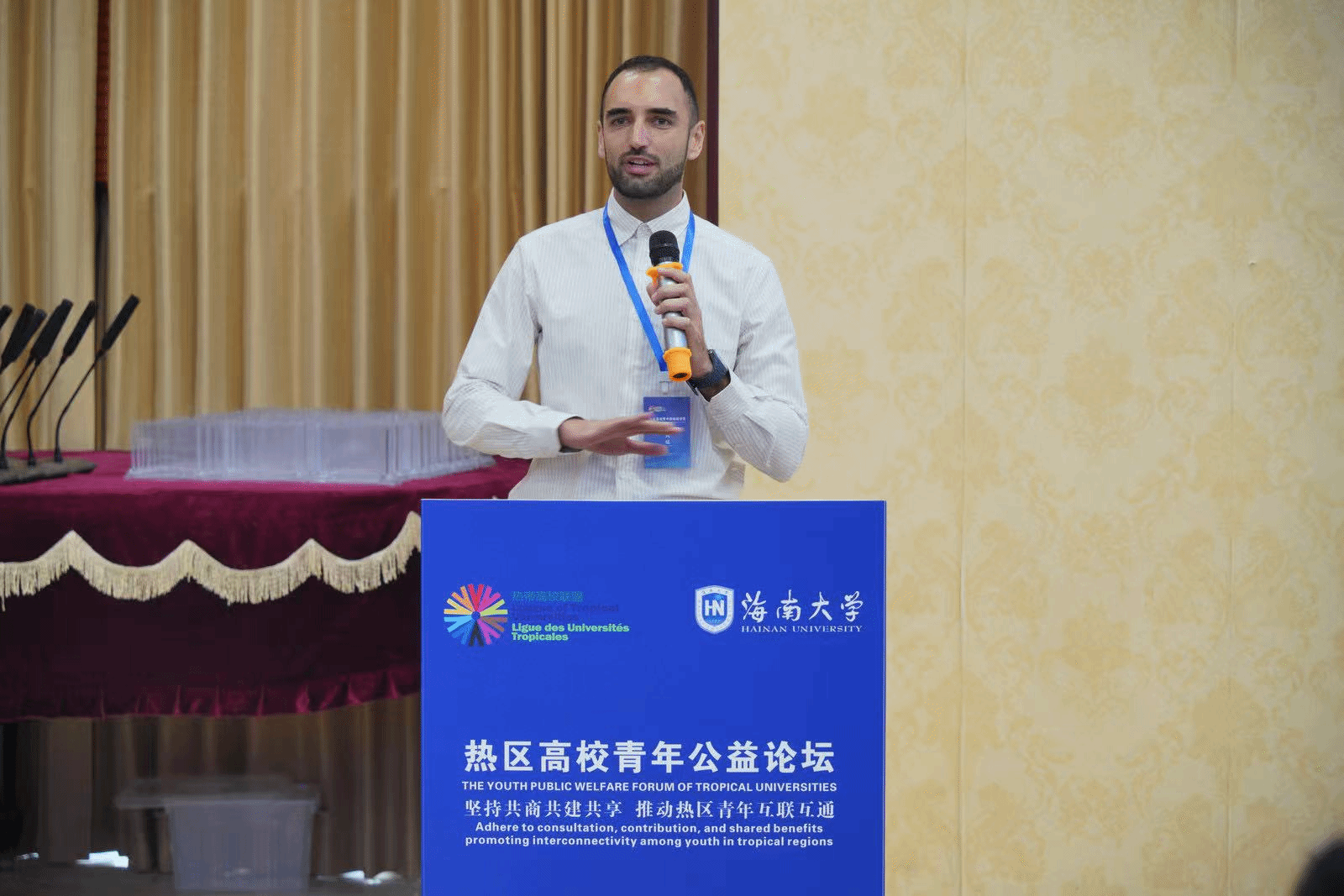 4月15日上午,热区高校青年公益论坛在PA视讯集团网站思源学堂多功能厅举行。这是西班牙青年营员在作交流分享。